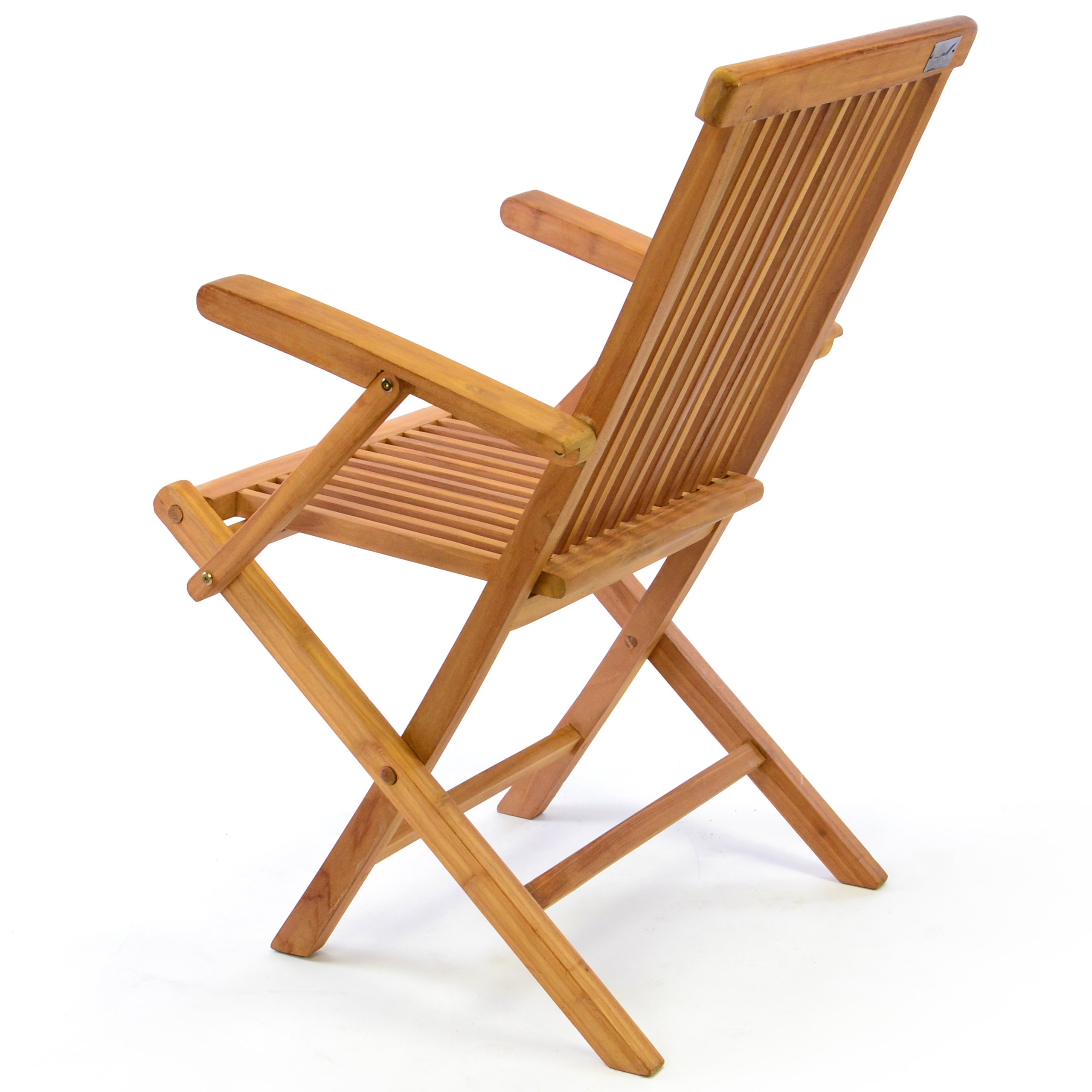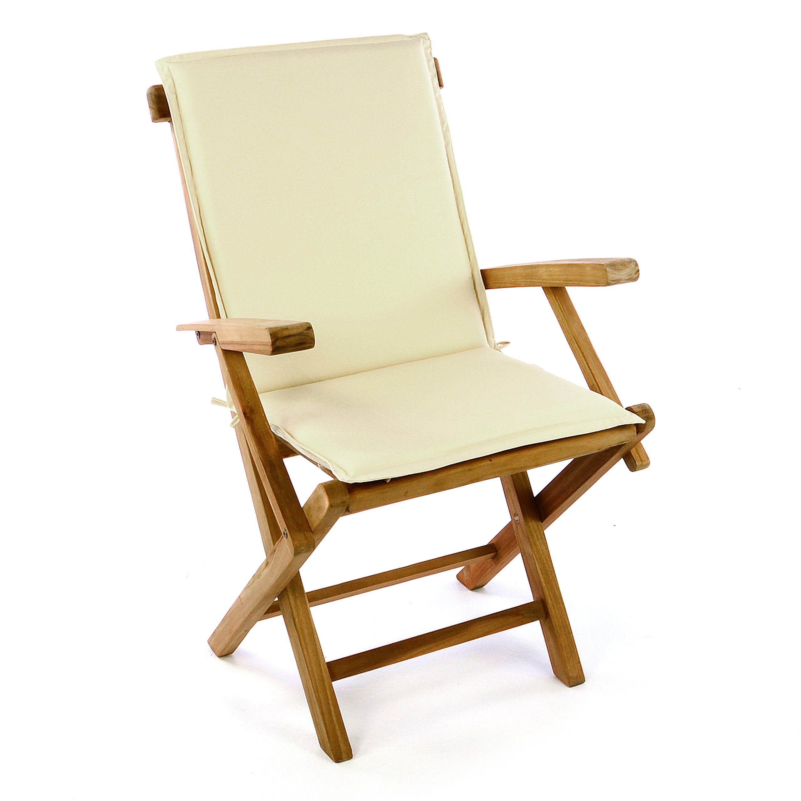Praktischer, in Handarbeit aus massivem Teak gefertigter, hochwertig verarbeiteter Balkon- und Terrassenstuhl mit Armlehne und Sitzauflage in der Farbe creme. Diesen Holzstuhl können Sie zusammenklappen und somit praktisch und platzsparend im Winter lagern.