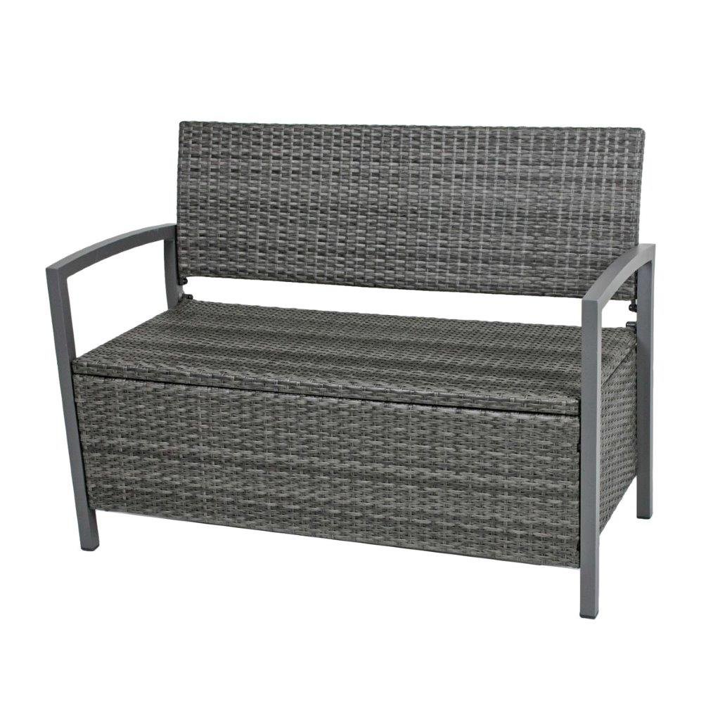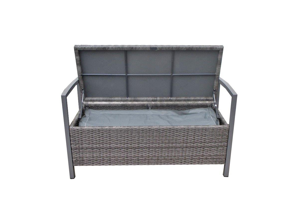 Platz nehmen und sich wohl fühlen: Das scheint die Gartenbank FERRARA in einem gefälligen Dunkelgrau fast zu schreien. Was Sie aber nicht sofort ahnen können, ist der Extranutzen, den dieses komfortable Möbel für Terrasse und Garten Ihnen auch noch bietet. Eine Truhe ist nämlich auch mit von der Partie. Sie werden sehen, alles wird plötzlich ganz leicht. Die Kissen sollen nach der Siesta wieder verschwinden? Kein Problem, klappen Sie einfach den Deckel hoch und schon haben Sie jede Menge Platz. Hinein mit allem, was nicht für Blicke von Nachbarn oder Elstern gedacht ist! Haltbar ist dieses Multimöbel aber auch und trotzt Wind und Wetter. Das kommt von der Kombi aus Aluminium und Polygeflecht, beides echte Kämpfer gegen Korrosion und andere Widrigkeiten. Maße ca. B/H/T: 117 x 86 x 58 cm, Alurohr: 30 x 30 x 1,2 mm, Kunststoffgeflecht Farbe Dunkelgrau, Sitzbreite 110 cm, Sitztiefe 47 cm, Sitzhöhe 46 cm. Die Gartenbank lässt sich schnell und einfach montieren.