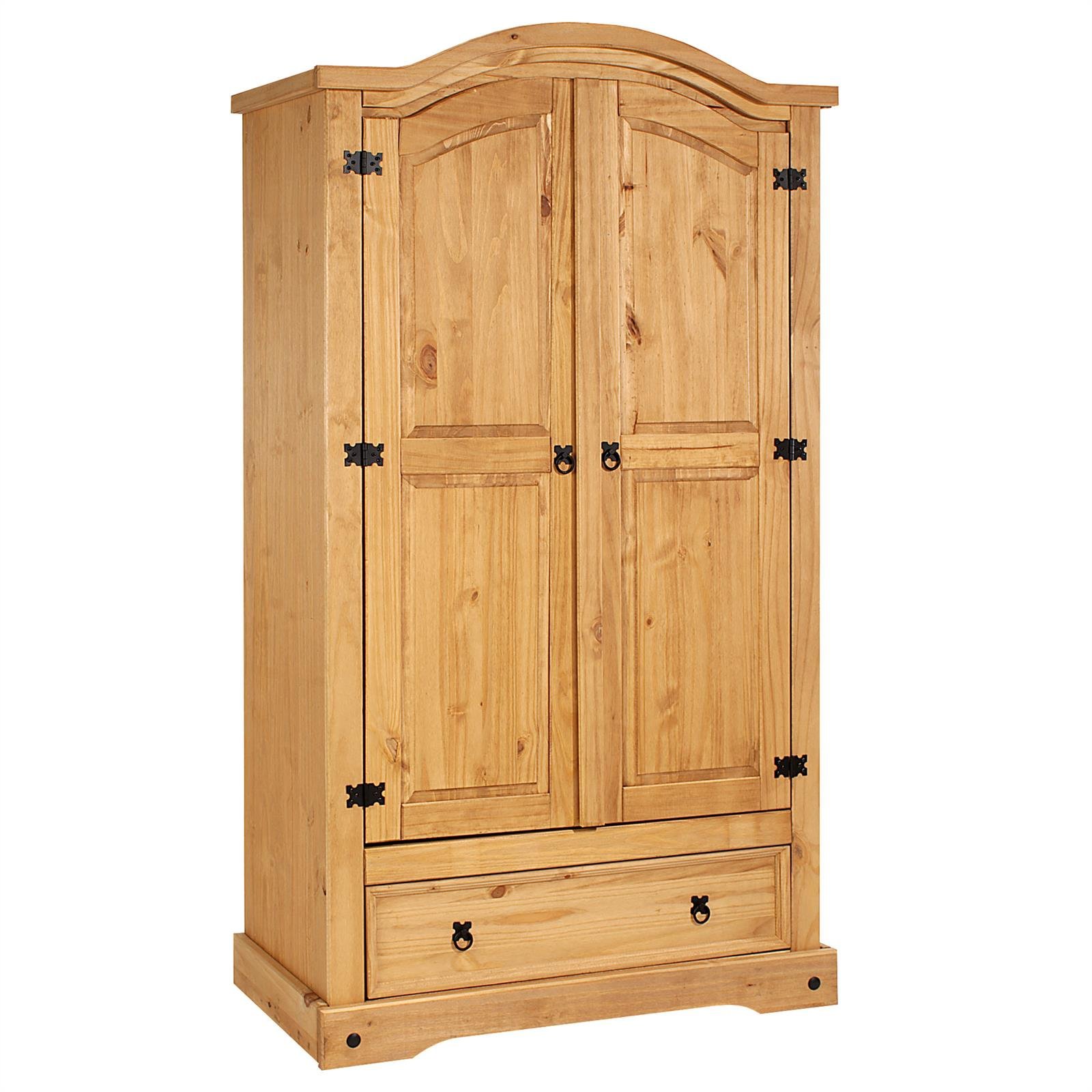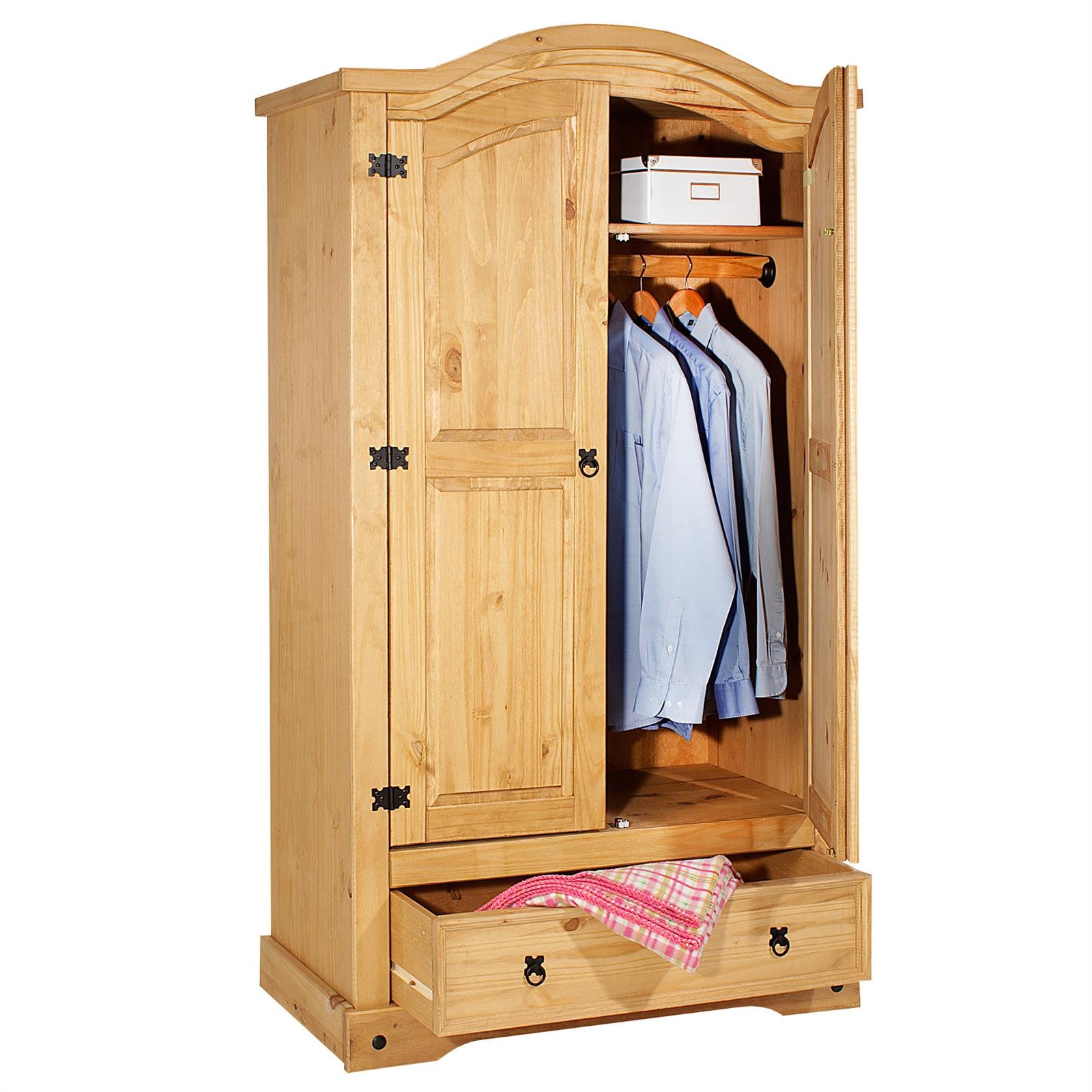 …im Kolonialstil lässt sich optimal in verschiedene Raumkonzepte integrieren. Der Garderobenschrank überzeugt durch die funktionale Aufteilung von Einlegeboden und Kleiderstange und zeigt mit den dekorativen Fräsungen, sowie den Beschlägen aus schwarzem Metall Liebe zum Detail. Weiterer Stauraum wird durch die zusätzliche Schublade geschaffen. Mit den passenden Mexiko Möbeln aus der Serie SALSA kann der Schrank gut kombiniert werden.