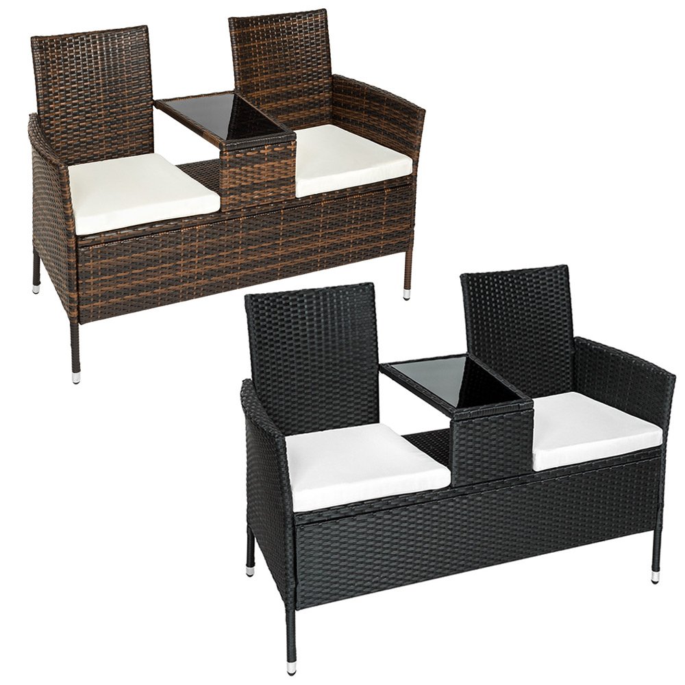 Gartenbank ist der integrierte Tisch in der Mitte. Auf der eleganten Glasplatte lassen sich auf praktische Weise ihre Drinks, ein Buch oder Sonnencreme abstellen.